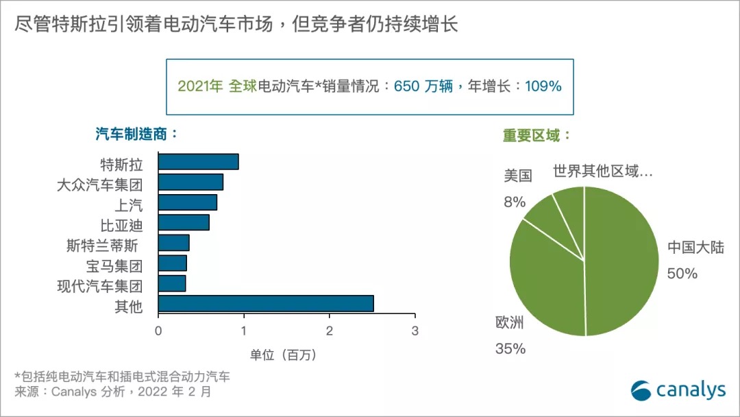 在对全球电动轿车商场的最新研讨中, Canalys 显现,2021 年全球电动轿车 (EV)的销量达650 万辆,同比添加109%, 占悉数乘用车销量的 9%。受新冠疫情和芯片缺少的影响,2021 年全球轿车商场总出售量仅添加 4%。