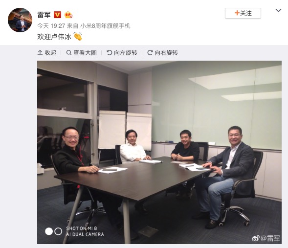 我国智能手机厂商小米科技创始人、董事长兼首席执行官雷军今晚发布一条微博“欢迎卢伟冰”,配图则显现金立手机原总裁卢伟冰正与雷军、黎万强、林斌坐在一同。在这条微博下方的谈论中,雷军进一步承认卢伟冰参加小米。