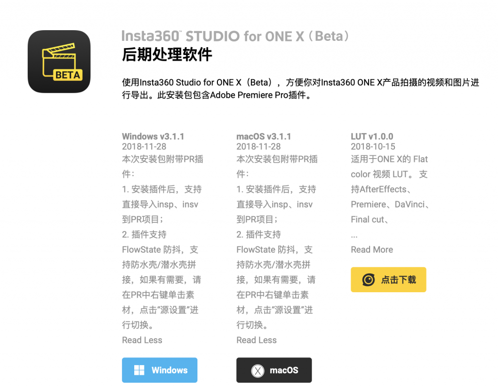 无法生成的文件过于巨大,也因为格局所限不支撑读卡器直接导下手机相册,笔者下载了(下图)官方引荐的 Studio 3 客户端,Insta 360 给它的界说是导出东西(仍是beta版别),一起也支撑 Premiere 的插件作用(可选),但很为难的工作便是因为全景格局的特殊性,是无法直接导入第三方修改器,较为繁琐。