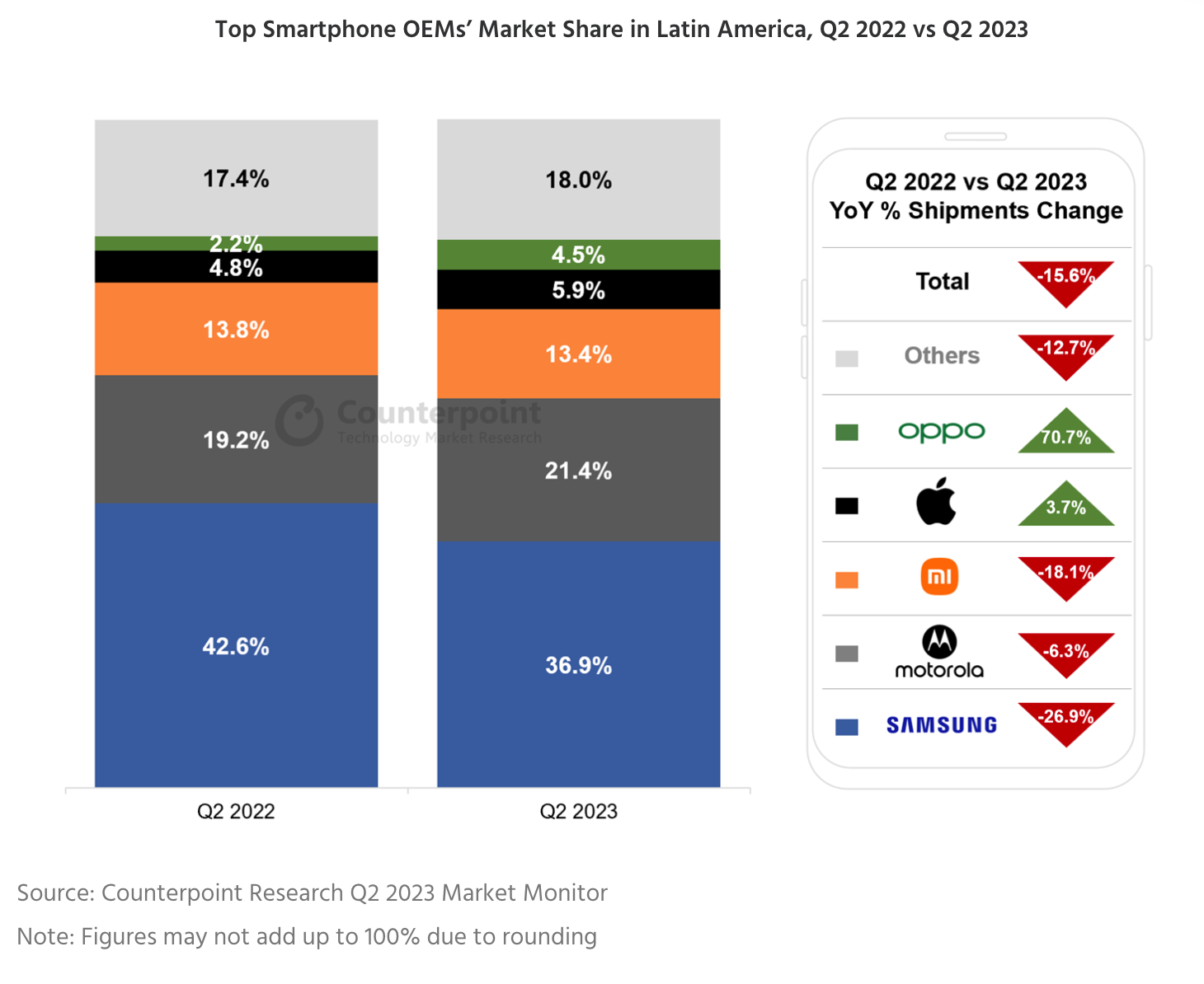 依据Counterpoint Research商场监测服务的最新数据,2023 年第二季度拉丁美洲 (LATAM) 的 智能手机出货量同比下降 15.6%,但环比增加 2.4% 。下降的原因是区域经济危机和全球智能手机出货量疲软的负面影响。