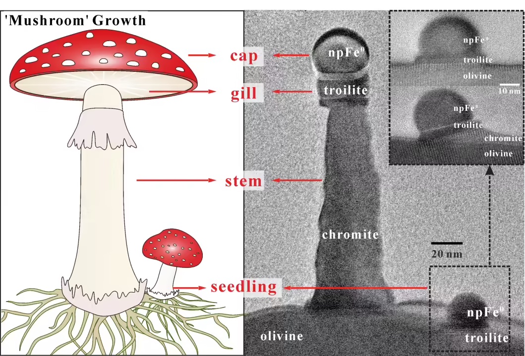 他们在样品中观察到一种稀有的由铬铁矿-陨硫铁纳米球-零价铁纳米球组成的枝晶结构,如蘑菇一般从橄榄石外表笔直成长。